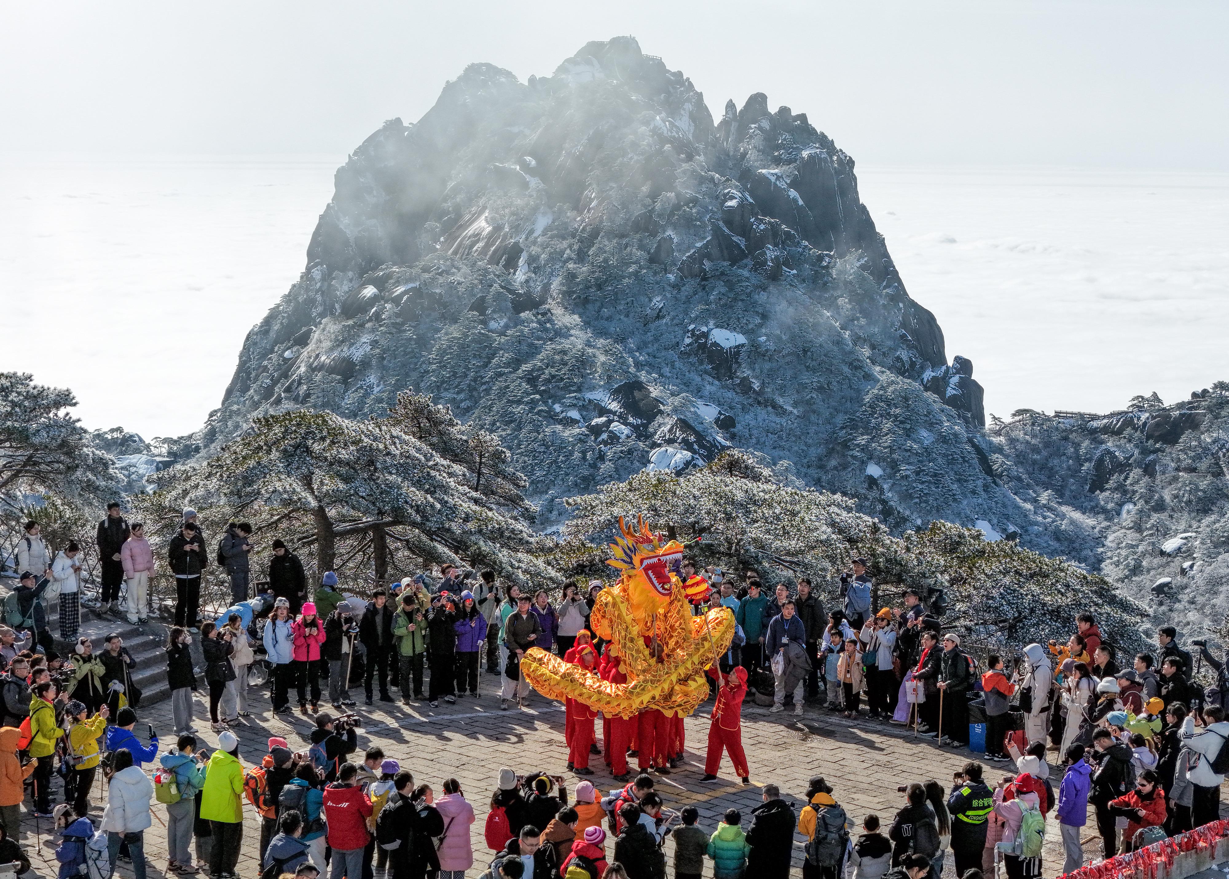 黄山之巅舞龙闹春 游客乐享民俗盛宴