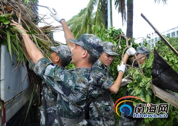 9月17日上午9时许,海南省军区某通信团100余名官兵,奔赴海口市的大街小巷,帮助驻地群众抗风救灾,清除路障,恢复交通,整治城区环境卫生。救灾现场,一群20余名的身着迷彩、未挂军衔的特殊身影引起了记者的关注,他们用肩抗、用手抬,整治倒伏树木、清理道路垃圾。原来,他们是该团前不久刚入伍的新战士,因为还未授衔所以特殊的军装格外瞩目。