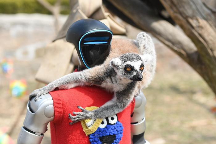 山东青岛:智能机器人亮相野生动物园 人机共舞引客来