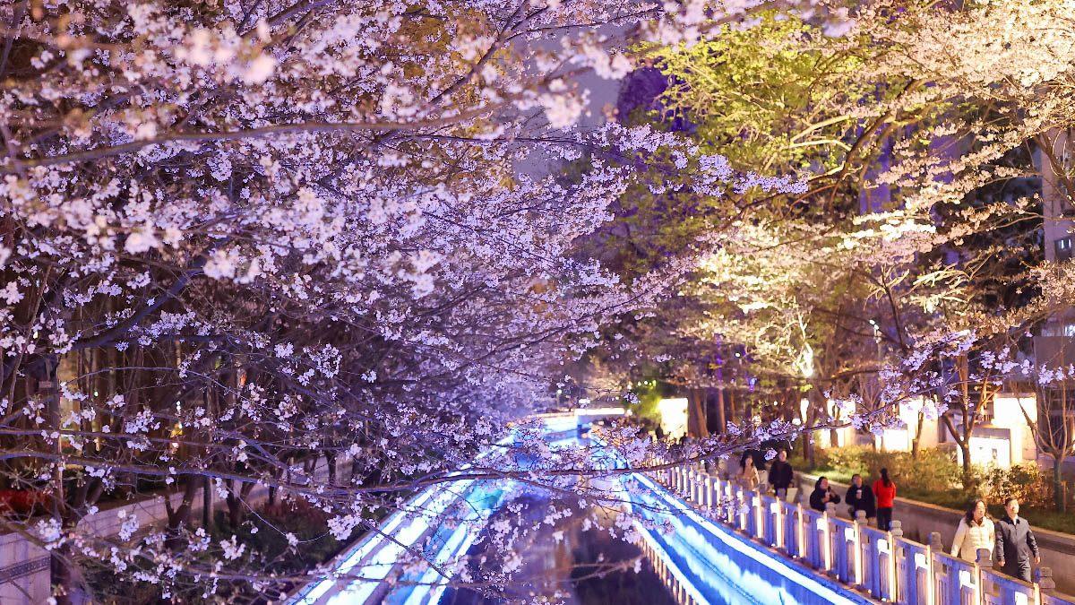 南京:夜樱盛放扮靓城市河畔
