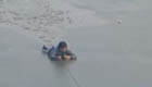 男子破冰钓鱼落冰窟 消防抛绳拖拽上岸