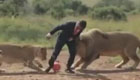 实拍非洲饲养员与群狮踢足球