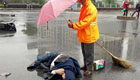 车祸现场 环卫工交警为伤者撑伞