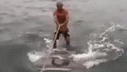 冲浪者把鲨鱼当冲浪板