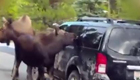 驼鹿伸长舌舔遍越野车