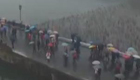 游客打伞看雪情 西湖断桥变“伞桥”