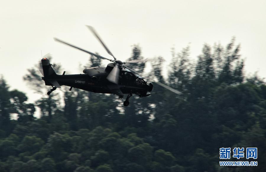 2012年11月11日,国产武直10武装直升机在珠海三灶机场进行飞行训练。当日,我国自主研制生产的武直10武装直升机在珠海三灶机场进行了约20分钟的适应性飞行训练,做出倒飞、莱维斯曼机动、高速大角度俯冲、低空小半径盘旋等动作,展现出其优异性能,引来航展现场观众频频喝彩。杨光 摄 图片来源:新华网